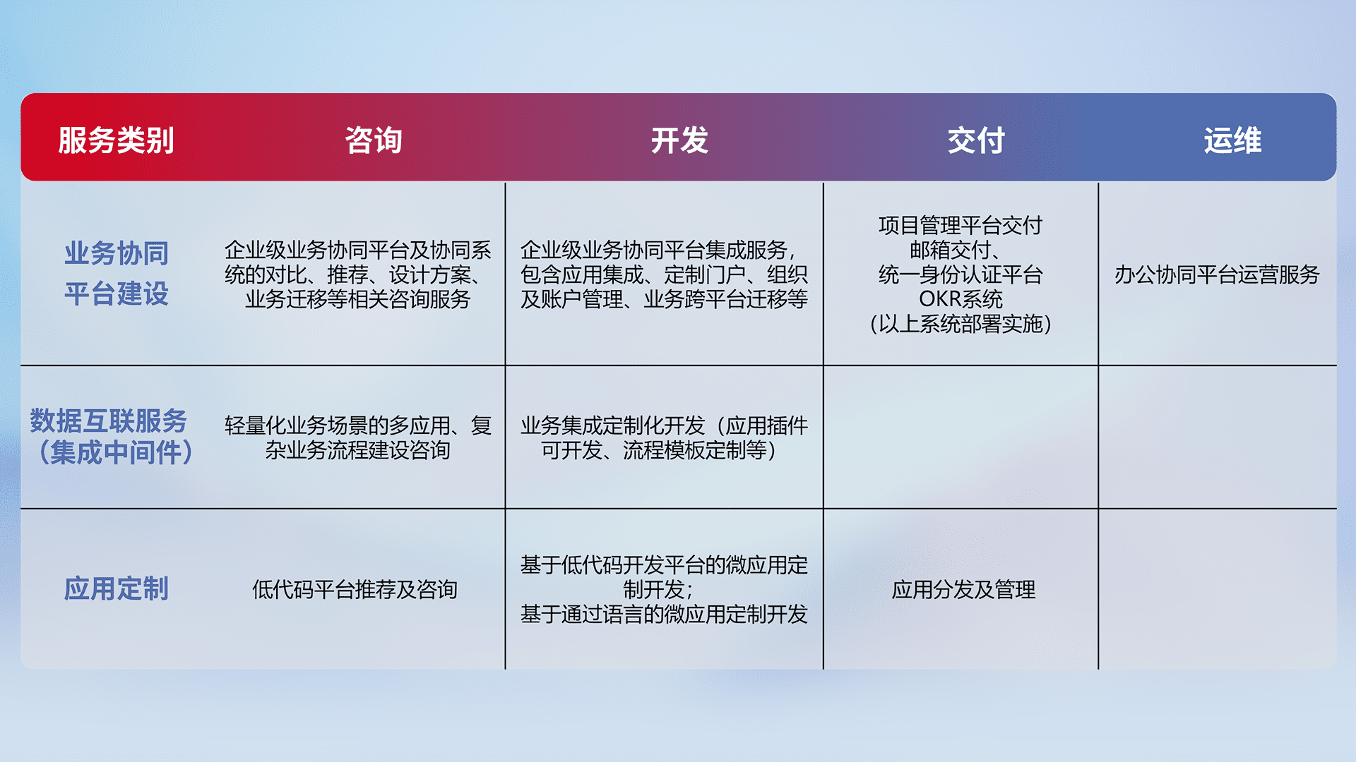 针对钉钉、、、企微、、、IDaas等平台级产品提供产品的规划、、、方案、、、交付、、、定制化开发等服务,,实现如统一协同办公、、、、智能客户服务、、、、混合会议管理、、智能数据查询、、等业务场景,,,,实现数字化转型。。。。